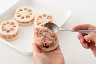 ①のれんこんの水気をとり小麦粉を薄くはたき鶏ミンチを挟む。