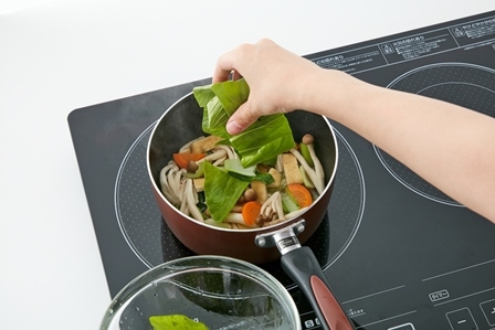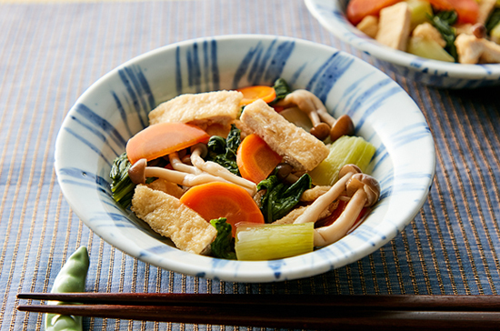 火が通ったら油揚げ、きのこを加え最後に残りのチンゲン菜の葉を加えてさっと煮る。