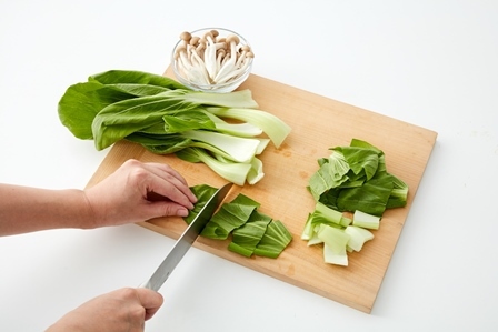 しめじは石づきを落とし手で割く。チンゲン菜は茎の部分は2cm幅に、葉の部分はざく切りにする。