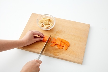 にんじんは2mm幅のいちょう切り、または半月切りにする。油揚げは熱湯で油抜きをし1cm幅の短冊切りにする。