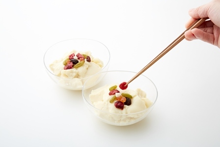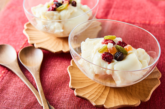 ③が固まったらスプーンですくって器に盛り付ける。仕上げにドライフルーツをのせる。