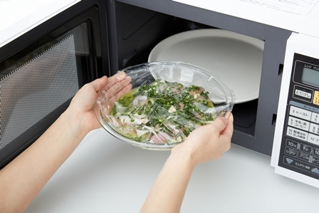 ②を耐熱皿に並べ、ふんわりラップをかぶせ、電子レンジで5分加熱する。加熱にムラがある場合は、混ぜて再度2分加熱する。