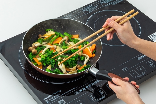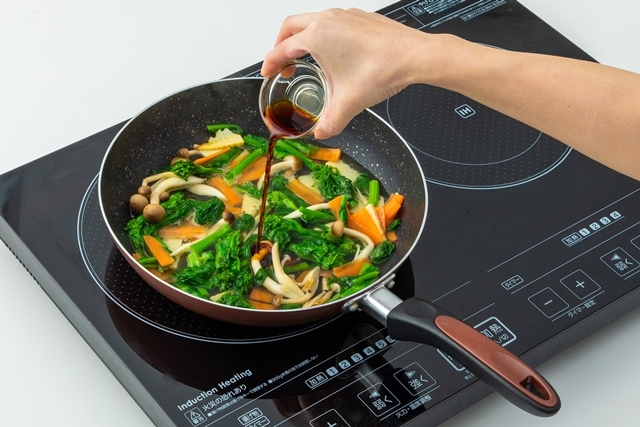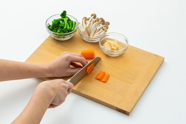 フライパンにサラダ油を熱し、①のにんじん、ぶなしめじを軽く炒めたらたけのこと菜の花の順に加え炒めあわせる。