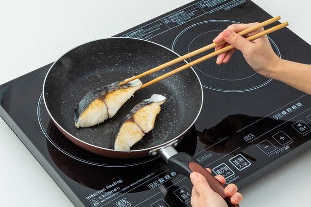 さわらに塩を振り軽く水気をふいたら、フライパンでこんがりと焼き、器に盛り付ける。