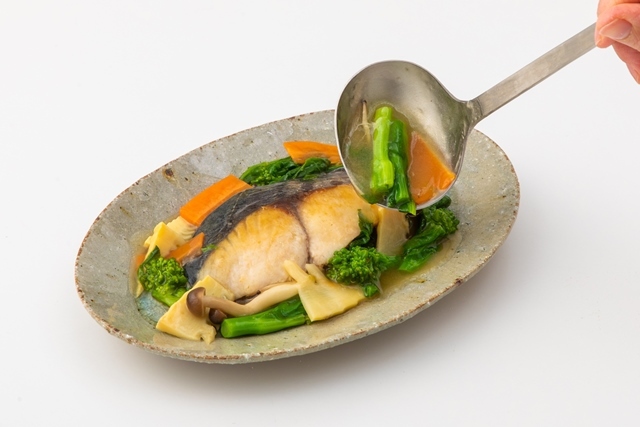 旬の食材をふんだんに使用!あんかけにすると減塩していても、しっかり味を感じることができます。菜の花の苦みもアクセントに。