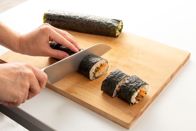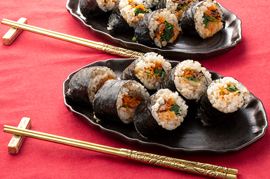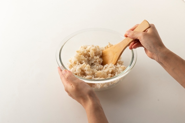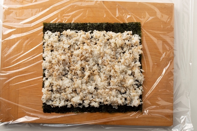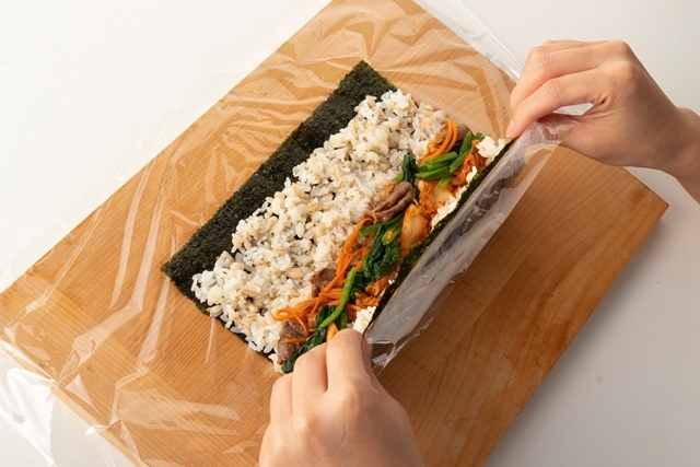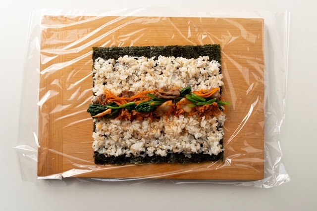 「巻きす」がなくても、ラップで巻けます!ほうれん草はほかの葉野菜やもやしでも代用可能です。水加減はもち麦の種類によって調整してください。