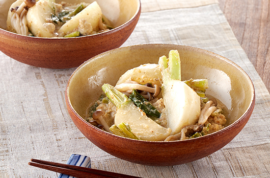 牛乳の代わりに豆乳をつかうことで糖質オフ。かぶは煮るととろとろの食感に。ビタミンC豊富な葉も一緒に摂りましょう。すりごまを入れることで風味と腹持ちアップが期待できます。