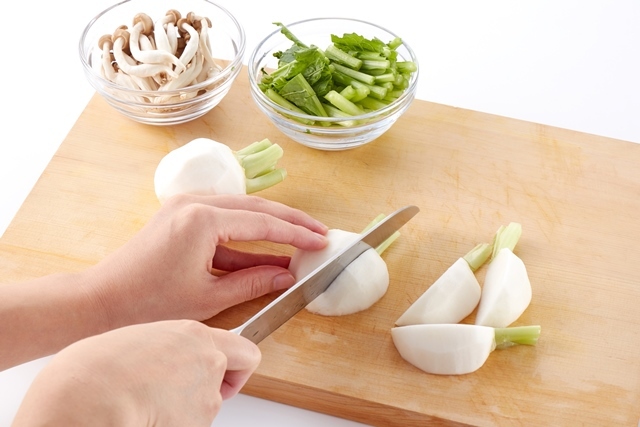 かぶは皮をむき6等分のくし切りに、葉の部分も3cm幅に切る。しめじは石づきを落としてほぐしておく。