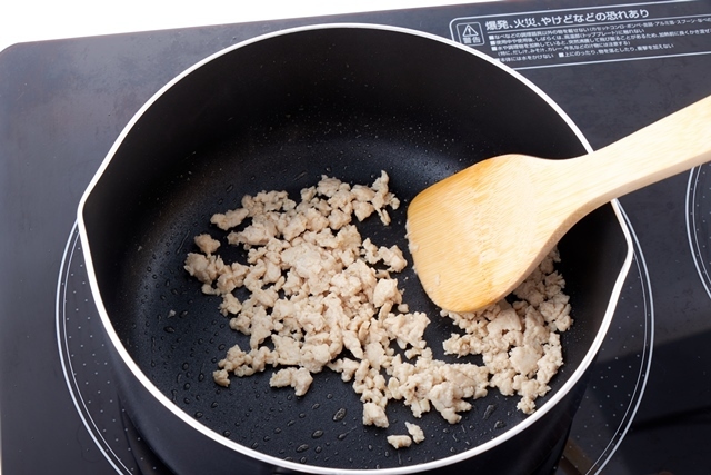 鍋にごま油を熱し鶏ひき肉を炒める。