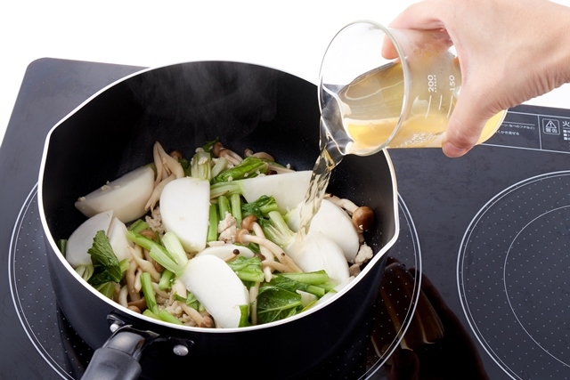 ②に①のかぶとしめじを加え、軽く炒めたらだし汁を加えて中火で5分程煮込む。