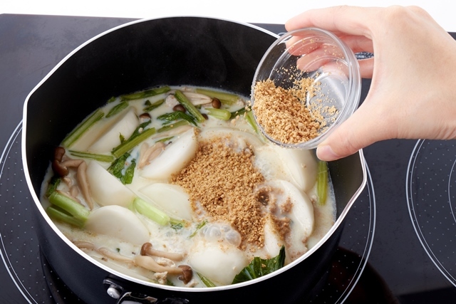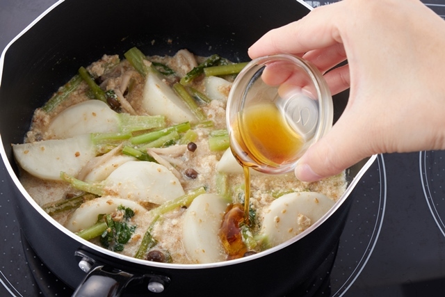 かぶに火が通ったら豆乳、すりごまを加えて弱火で3分程煮込む。