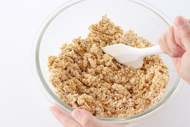 ①にオートミールを加え、ヘラなどでざっくりと切るように混ぜあわせる。