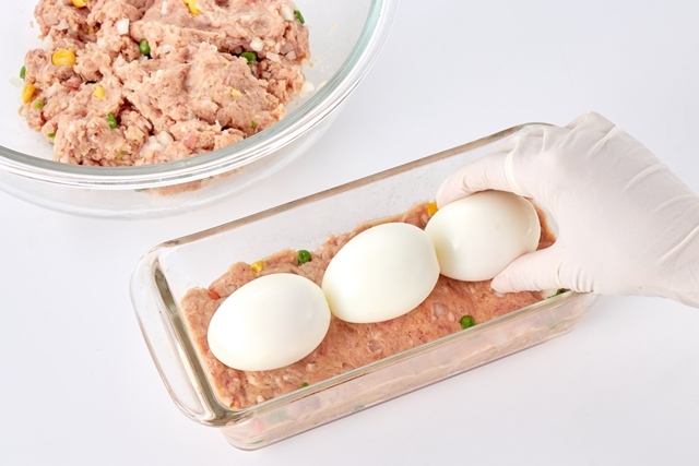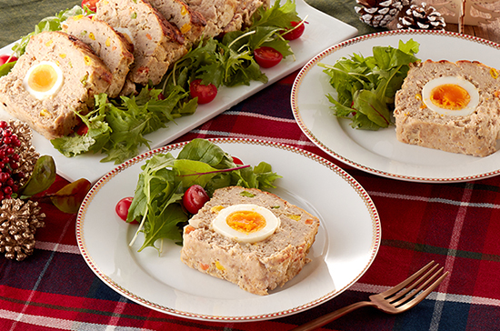切ったときの断面がきれいになるよう、卵はまっすぐに並べましょう。トナカイの角のピックを作ってつけると、よりクリスマス風になります。ケチャップとウスターソースを混ぜてソースを作っても美味しいです。(栄養計算には含まず)