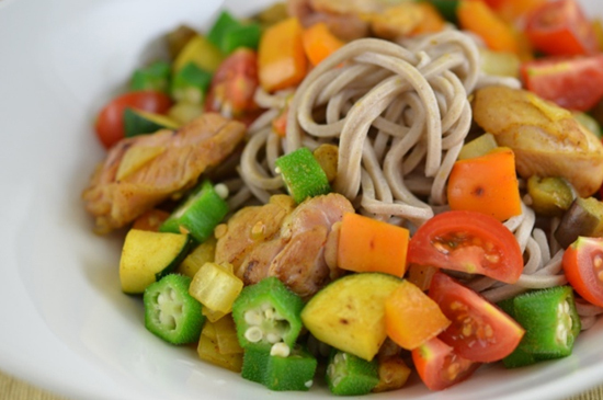 冷たいそばに夏のカラフルな野菜と鶏肉をトッピングしたビタミン・ミネラルがみなぎる麺レシピ。様々なスパイスが混ざったカレーパウダーとめんつゆの相性が想像を絶する味のハーモニーを生み出します!ボリュームもたっぷりです!