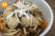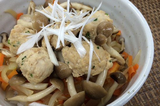 しょうが、きのこ、ごまの風味が、美味しさをひきたてた鶏のつくね丼をご家庭でお楽しみください。