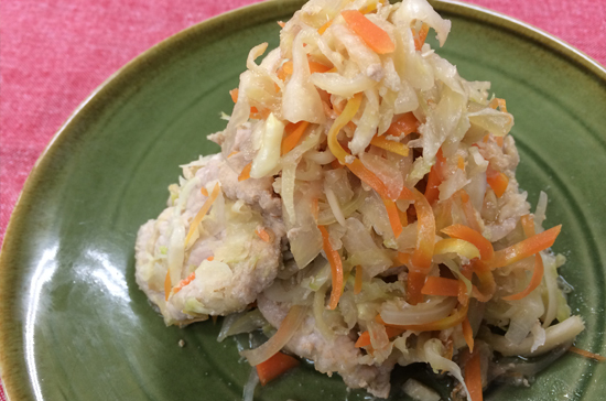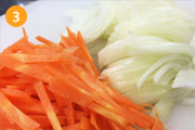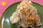 (4)を一度よく揉み込み、にんじん・玉ねぎを入れ、再度揉み込む。