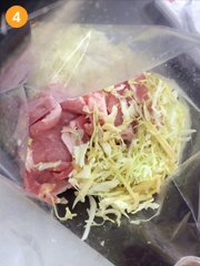 ポリ袋(ジップロックなどをご利用ください)に調味料Aを入れ、しょうが・キャベツ・豚肉の順に入れる。