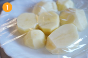 じゃがいもは皮をむき、厚さ2cmほどにスライスし、皿に大さじ2はいの水をいれ電子レンジ500wで3分加熱する。