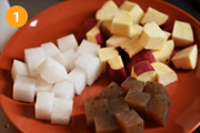 材料Aのさつまいも、大根、こんにゃくは約1.5cm角に切る。