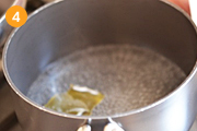 鍋に材料Bの水、昆布を入れて火にかけ、沸騰前になったら昆布を取り出す。
