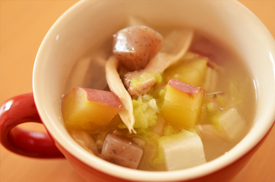 お味噌汁に旬の野菜をたっぷり入れ、塩麹で軽く味付け。野菜のうま味としょうがのピリッとした風味にどこか懐かしさを感じる一品です。
