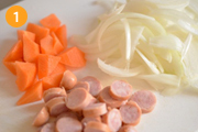 材料Aの(新)玉ねぎは薄くスライスし、にんじんは乱切り、ウインナ-は輪切りにする。