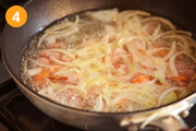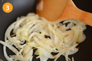 底の深い鍋にサラダ油をひき、(1)の玉ねぎをあめ色になるまで中火で炒める。