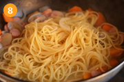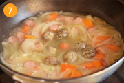 (3)に(1)のにんじん、ウインナーと材料Aの水を入れ、中火でにんじんが柔らかくなるまで煮る。