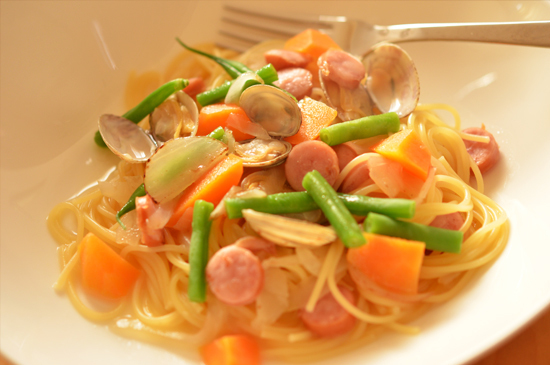 玉ねぎの甘味にウィンナーとあさりの旨みが絶妙に調合されたスープパスタはリピート間違いなしの1品!