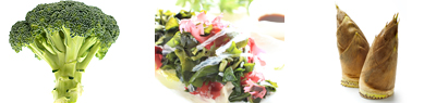 ごぼう、春菊、タケノコ、とうがらし、ブロッコリー、インゲン豆、海草類、玄米など