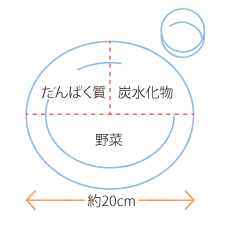 「量」を意識するのに、いちいち重さを測るのは面倒ですよね。そんなときは、お皿に盛る料理の割合でだいたいの量とバランスが把握できる「プレートメソッド」という方法がおすすめです。分量バランスが一目瞭然になるので、一度やってみてください。