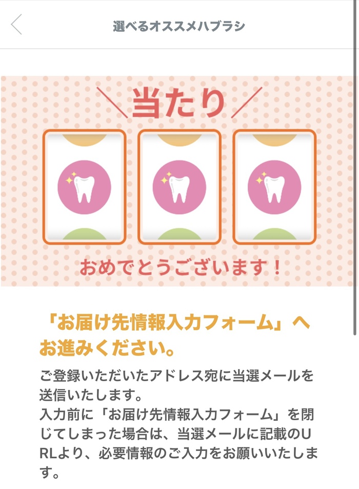 歯ブラシ大好き! 2022/10/25 コース3 ハブラシ初当選!!( ;∀;) 2023/01/29 コース3 2回目当選! 7/7 9:46/コース3当選! 11/24 10:31/久々当選(T-T) 2024/1/19当選🪥2/28当選🪥3/16当選🪥5/7オーラルヘルス対策セット当選!6/1🪥7/1🪥9/20🪥10/22🪥11/19