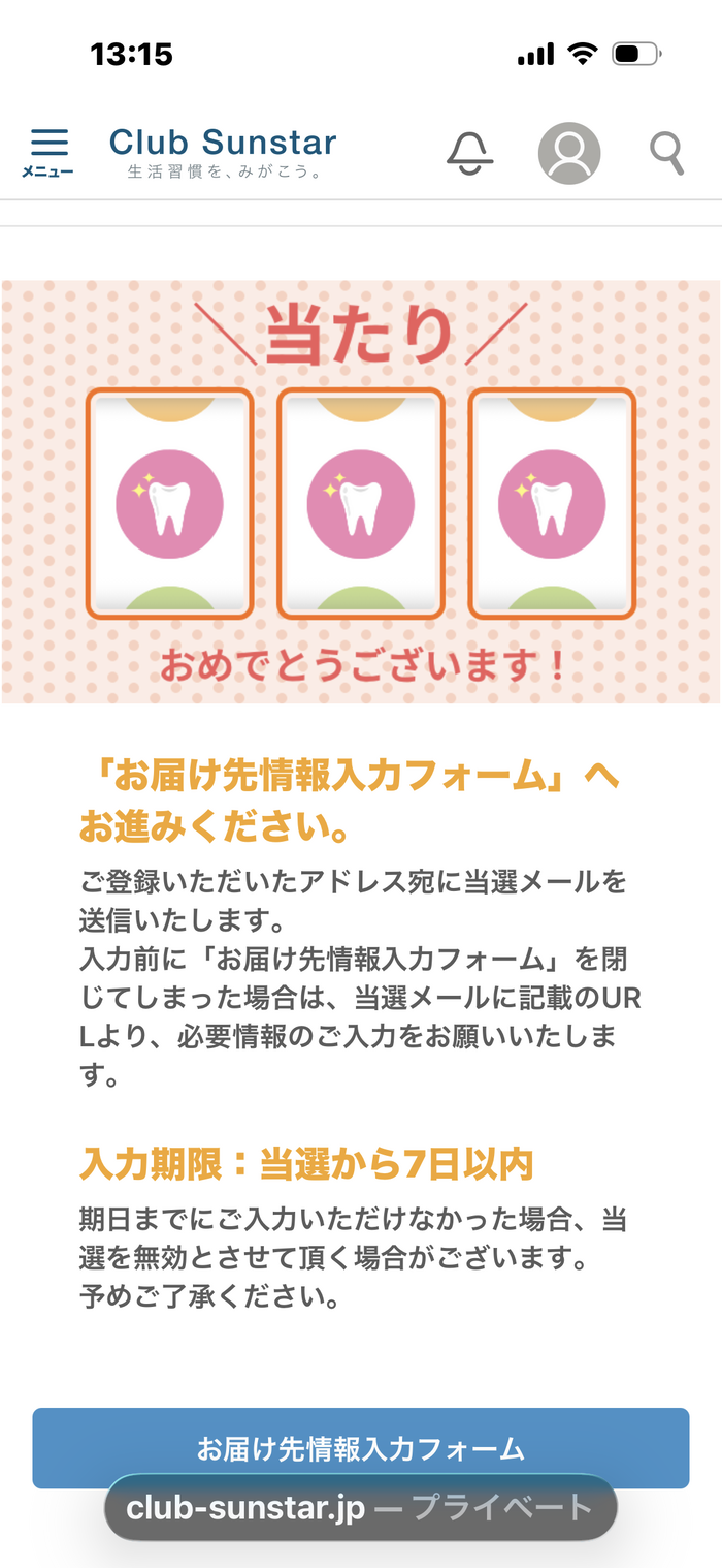 歯ブラシ大好き! 2022/10/25 コース3 ハブラシ初当選!!( ;∀;) 2023/01/29 コース3 2回目当選! 7/7 9:46/コース3当選! 11/24 10:31/久々当選(T-T) 2024/1/19当選🪥2/28当選🪥3/16当選🪥5/7オーラルヘルス対策セット当選!6/1🪥7/1🪥9/20🪥10/22🪥11/19 2025年一度も当選せず....😢最近電動アシスト歯ブラシを使い始めましたけっこうイイっ