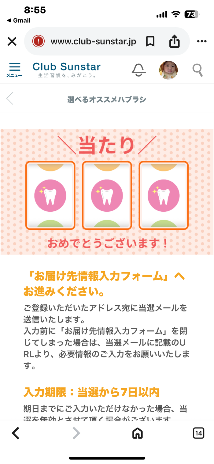 選べる歯ブラシ当たりました。今日は一日ハッピーです。有り難うございました♪♪