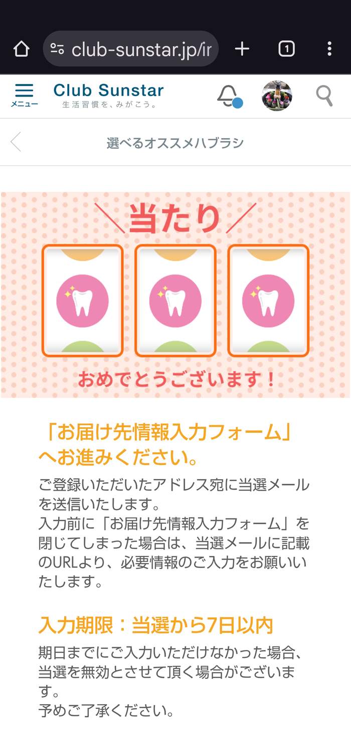 今月の歯ブラシ、当選しました\(^-^)/